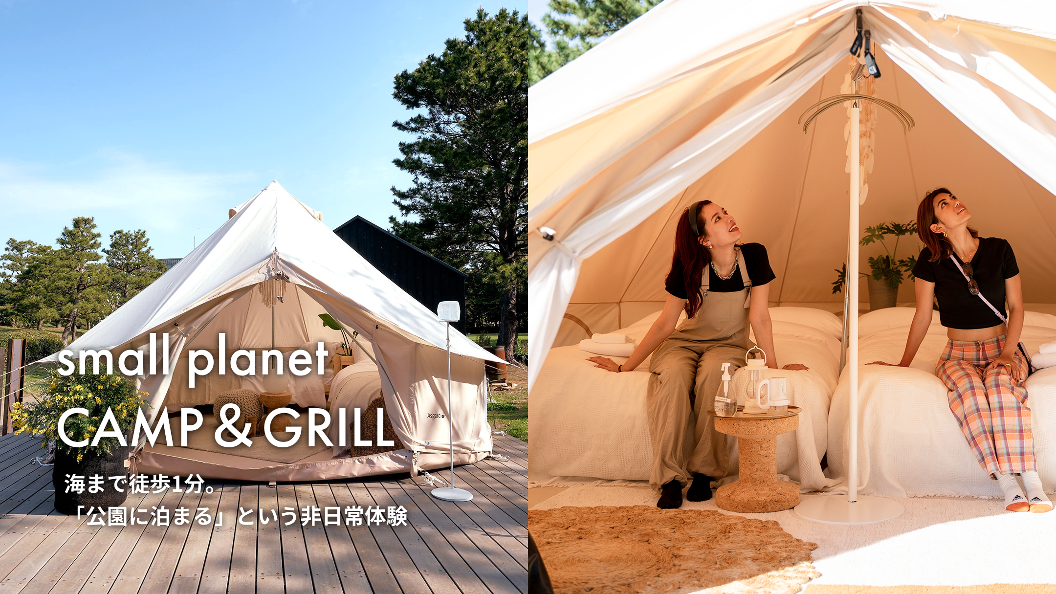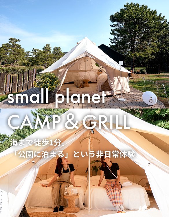 スモールプラネットでは、「公園に遊びに来て、そのまま公園に泊まる」という非日常の宿泊体験をご用意しています。オールインクルーシブなので、滞在中のドリンク飲み放題や、他施設の利用が無料になったりなど様々な特典もありアウトドア初心者の方でも安心してご利用いただけます。