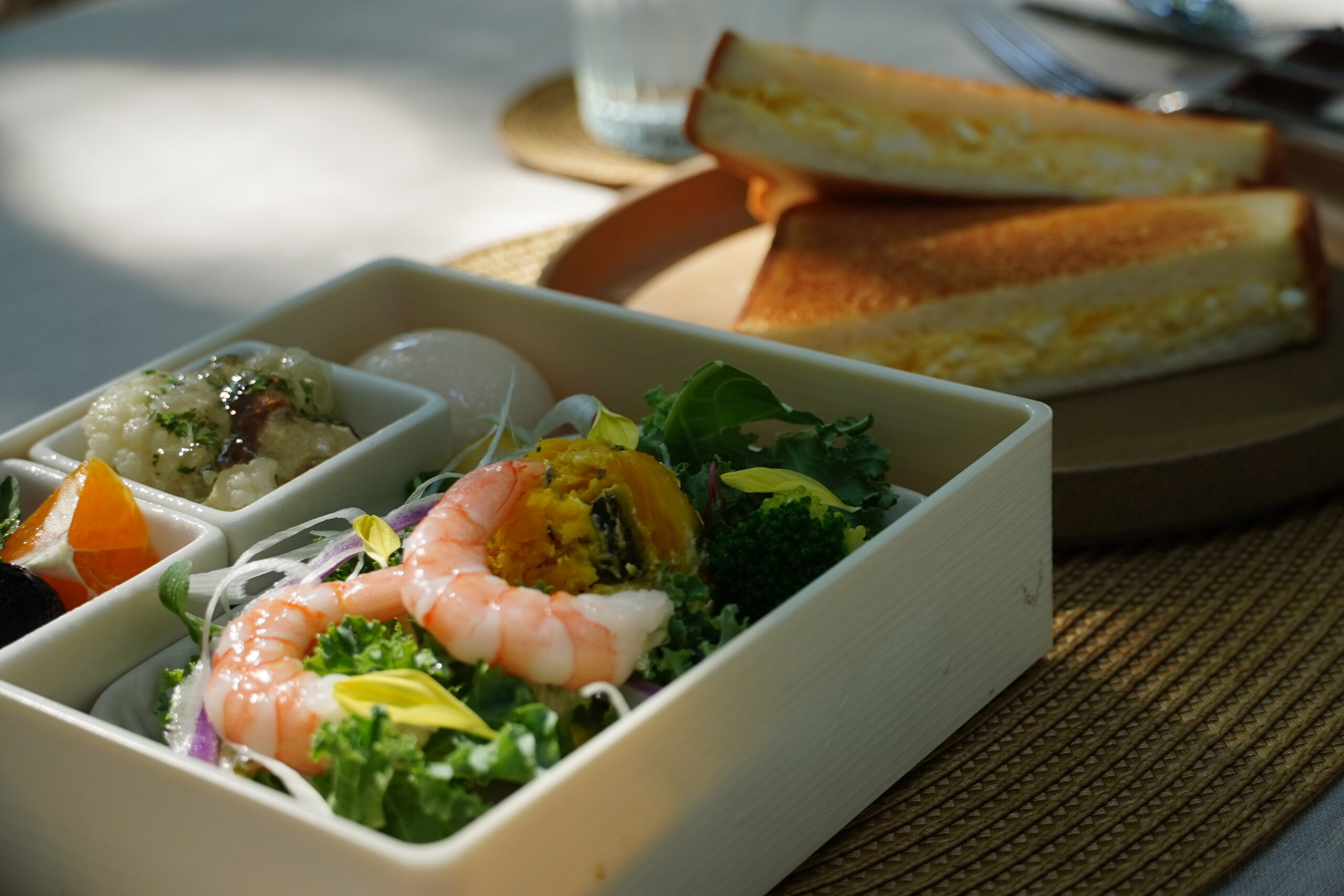 地元・林養鶏場の「初たまご」を贅沢に使用した、たっぷりたまごのホットサンドをメインに、朝の体にやさしいメニューをご用意しました。小海老と海藻のサラダは、海の恵みを感じるさっぱりとした味わい。