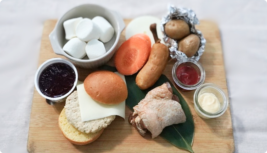 お子様にも楽しんでいただける、わくわくなメニューをご用意しました。チーズバーガーキットやてりやきチキン、骨付きソーセージに、彩り豊かな野菜を添えた食べやすい内容です。食後には、焼いて楽しめるマシュマロとゼリーをご用意。アウトドアならではの体験とともに、ご家族で楽しい食事の時間をお過ごしください。