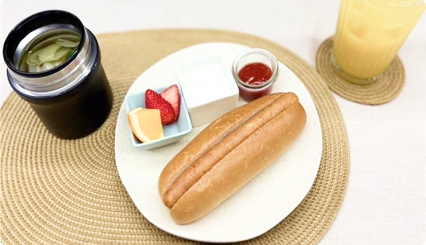 食べやすいミニホットドッグに、自家製ジャムとヨーグルト、季節のフルーツを添え、栄養バランスにも配慮しています。