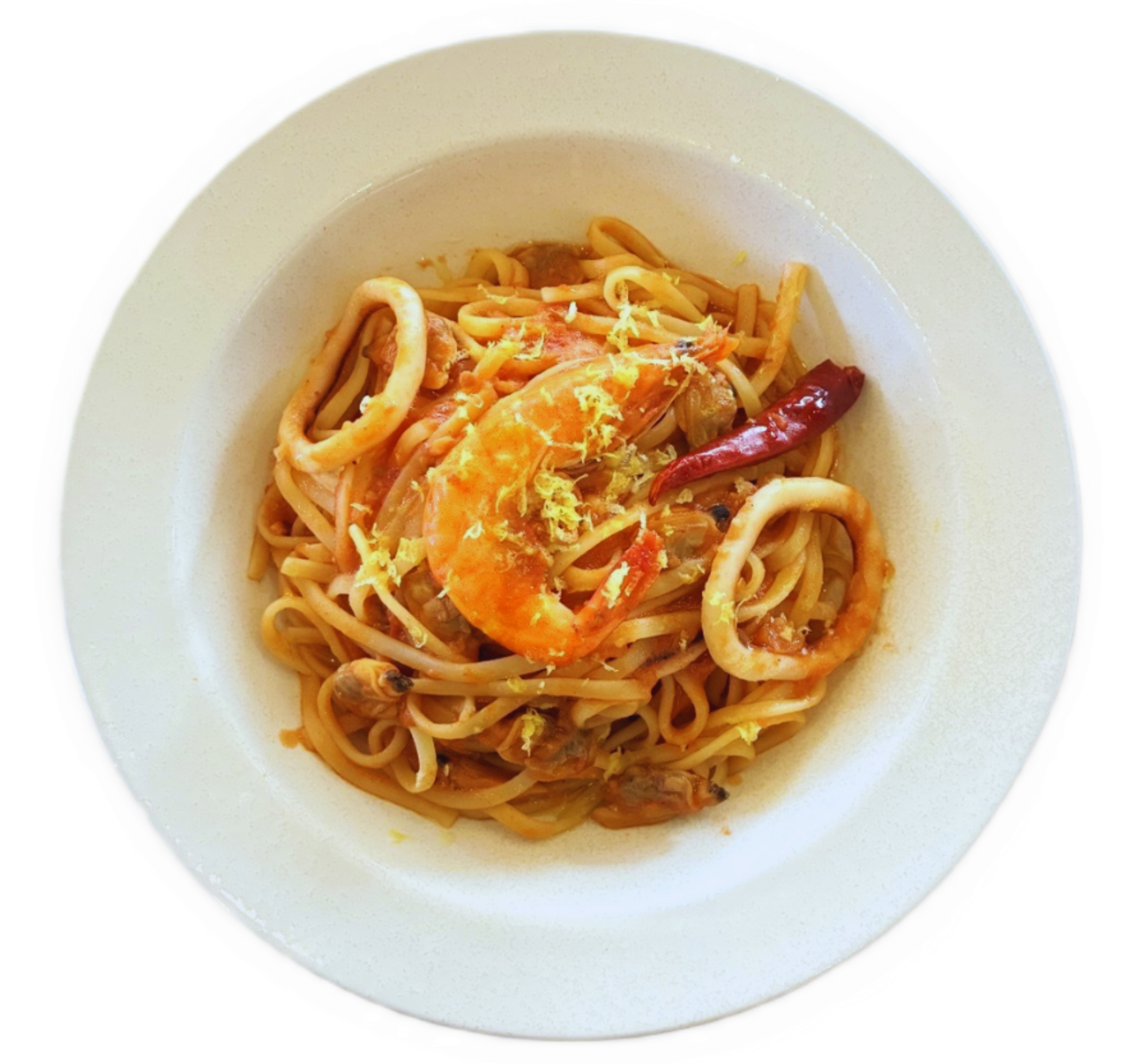 ソフトシェルシュリンプ・イカ・あさりのうま味をきかせた、大人の辛口トマトパスタ。