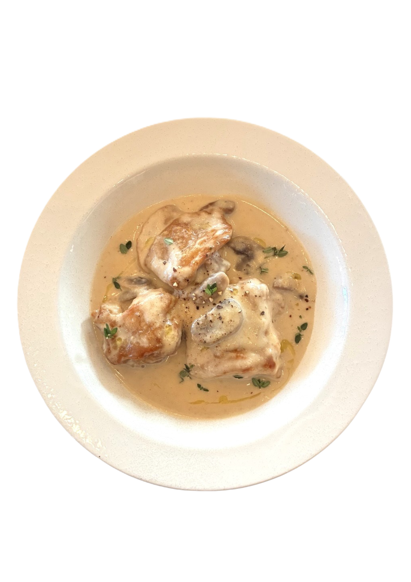 鶏もも肉とマッシュルームを白ワインと生クリームでやわらかく煮込んだ一皿。