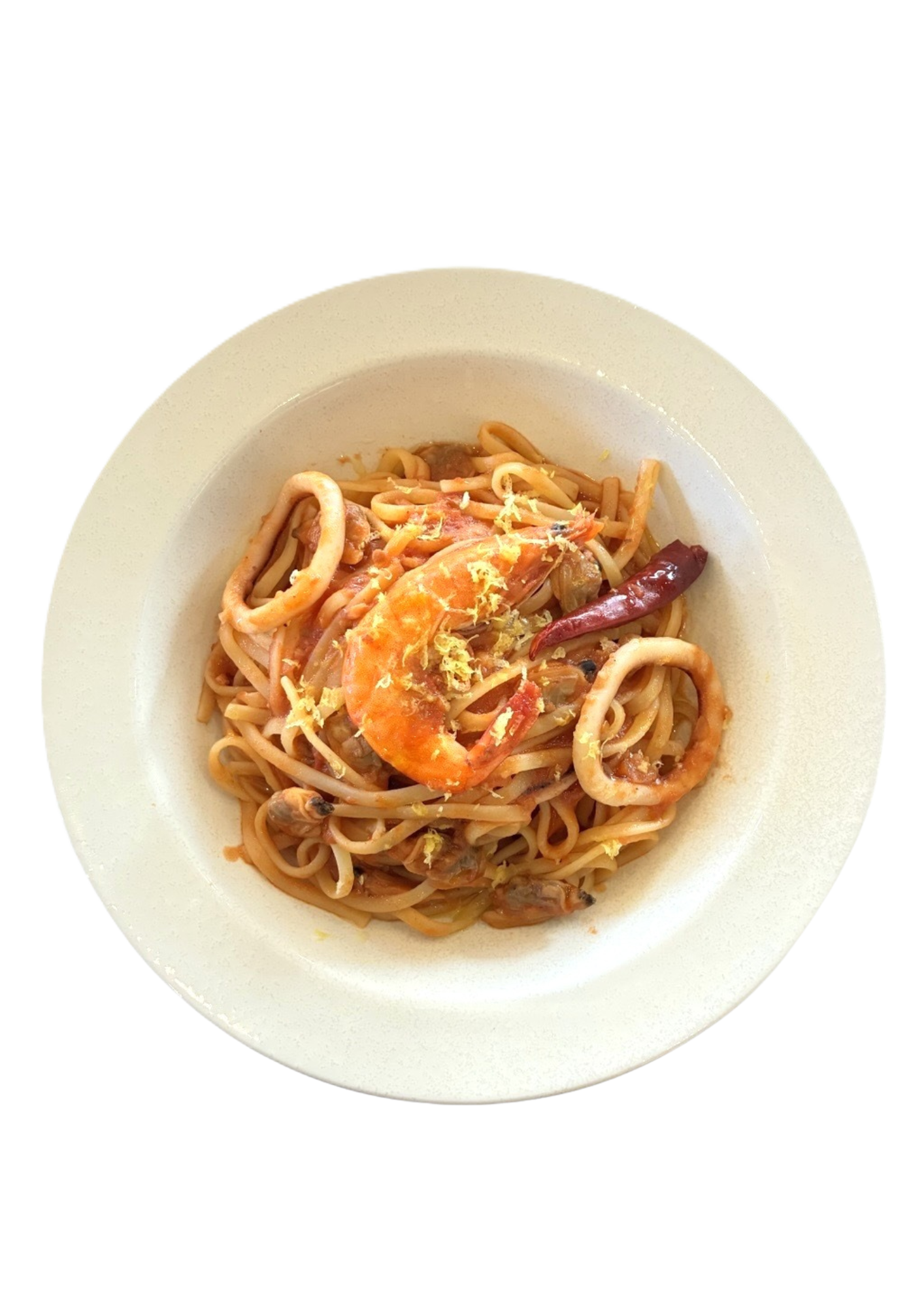 ソフトシェルシュリンプ・イカ・あさりのうま味をきかせた、大人の辛口トマトパスタ。